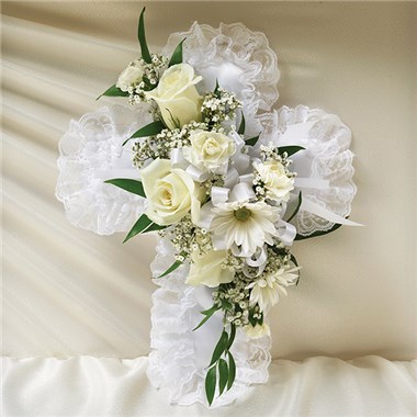 They lived their life with faith and love, which is how one can honor them. Our satin cross casket pillow, fashioned by our expert florists with a spray of pure white roses and white ribbon, is a simple yet elegant arrangement and a touching ornamental gesture. •Cross-shaped satin casket pillow is adorned with a spray of white roses, baby’s breath, ribbon and soft, lush greenery •Measures approximately 9”L x 9”W •Appropriate for the funeral home •Our florists use only the freshest flowers available, so colors and varieties may vary